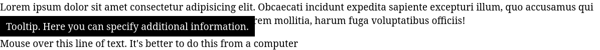 <p title="Tooltip. Here you can specify additional information">Mouse over this line of text. It's better to do it from a computer.</p>The title attribute can be used on any page element, not just paragraphs. These attributes are called global attributes, because they do not depend on the element. In contrast, there are attributes that are unique to one or more tags. For example, the attribute colspan which specifies the number of cells joined together in a table. Using it on anything other than a table makes no sense.
