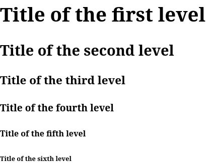 To create titles used 6 paired tags: <h1>, <h2>, <h3>, <h4>, <h5>, <h6>, where <h1> — title of the first level, the most important and describes the main subject of the text, and <h6> — the title of the lowest level.