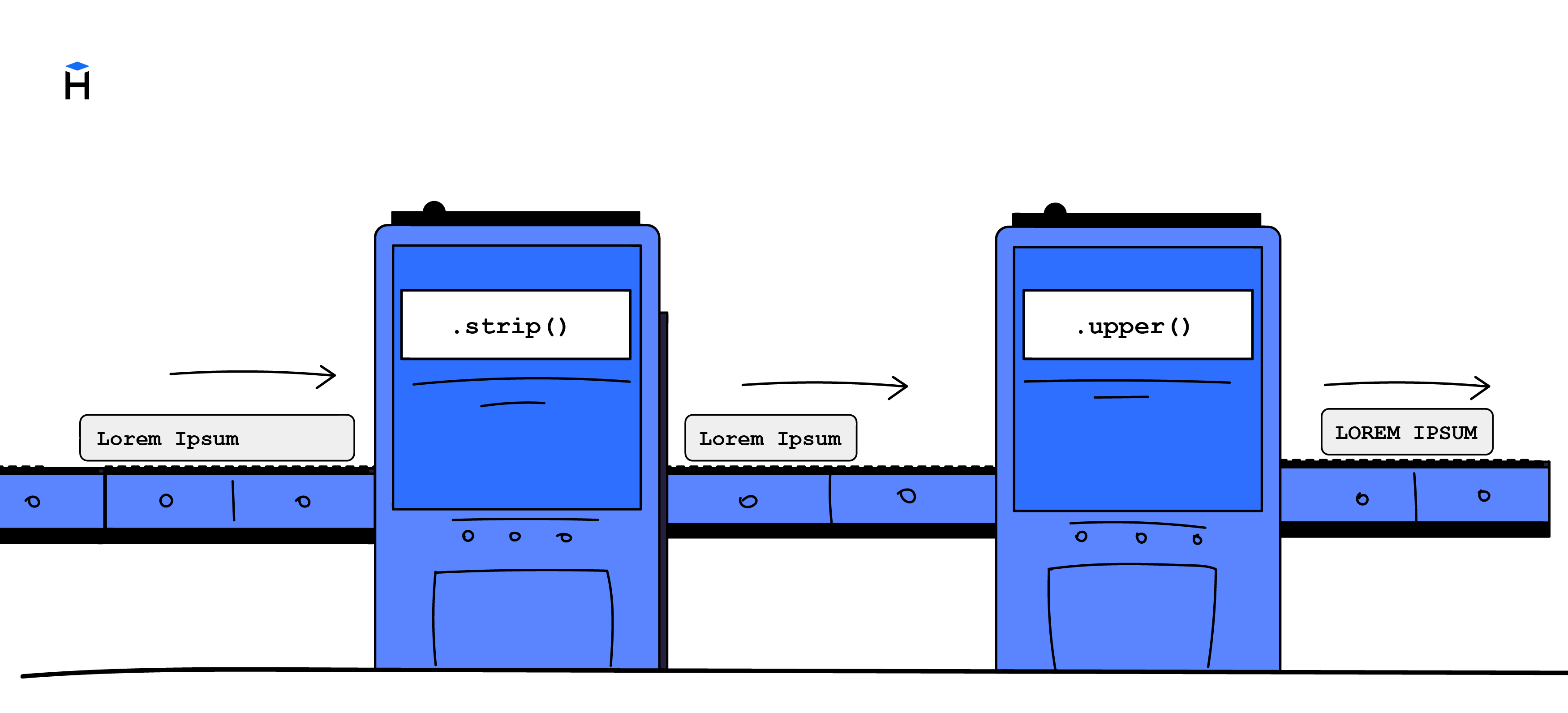 ' hExLeT '— исходная строка..strip()удаляет пробелы в начале и конце:'hExLeT'..lower()приводит строку к нижнему регистру:'hexlet'..replace('h', 'x')заменяет'h'на'x':'xexlet'.