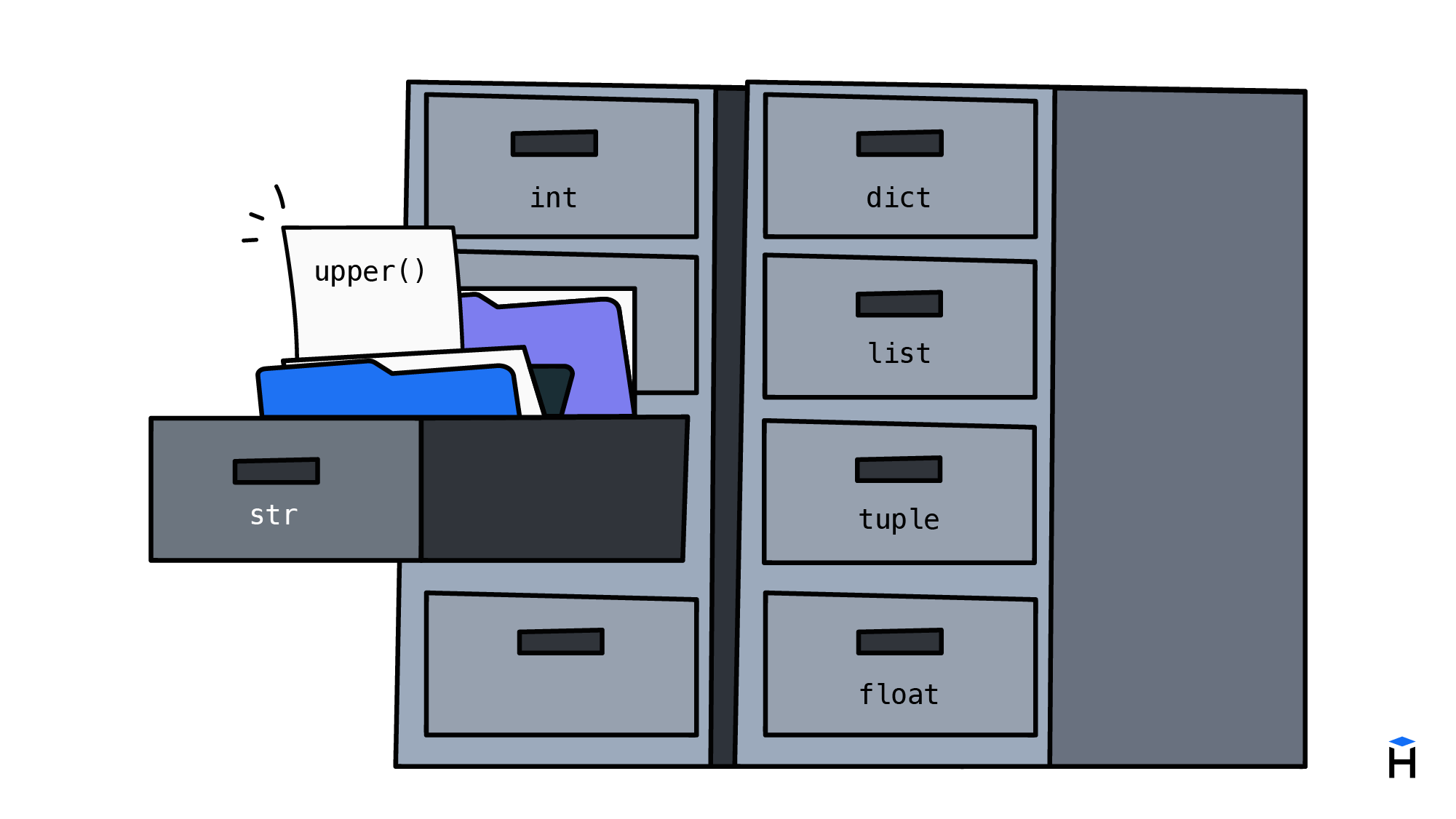 Например, у строк есть свои методы для преобразования текста. Метод upper() переводит все буквы в верхний регистр: